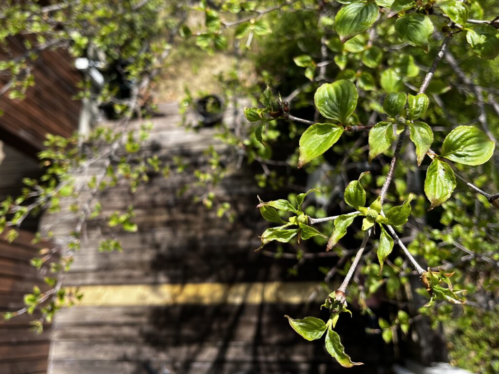 ヤマボウシの葉っぱもずいぶん開いてきた。ひと雨ごとに植物たちの様子が変わっていく。草木の間をすうっと風が通り抜けていく。